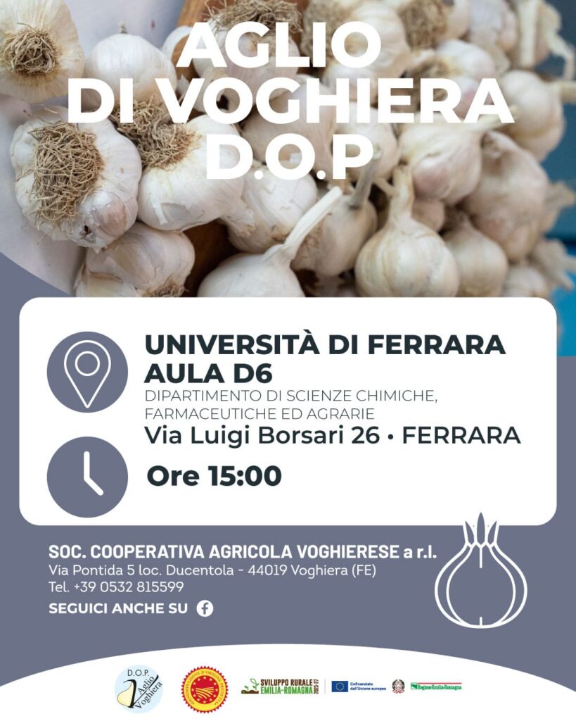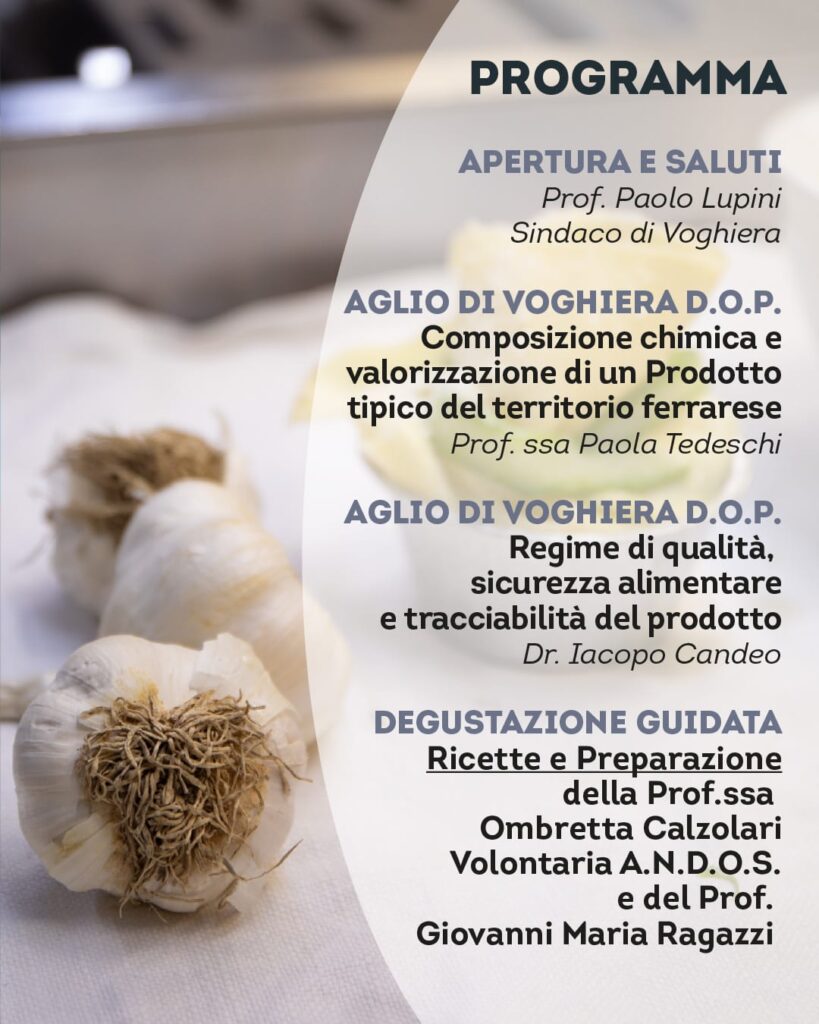 Le caratteristiche dell’Aglio di Voghiera derivano dal forte legame con il territorio e l’ambiente di produzione. Le caratteristiche tipiche del prodotto: bulbo rotondeggiante regolare, costituito da bulbilli uniti in forma compatta, profumo intenso, sono da attribuire ai terreni limoso-argillosi in cui viene coltivato. Tra i fattori pedoclimatici, che contribuiscono a rendere speciale l’aglio di Voghiera, rientra certamente anche il clima che è quello tipico della Pianura Padana Ferrarese. La composizione chimica è un perfetto equilibrio tra enzimi, vitamine, sali minerali e flavonoidi che conferiscono una specifica particolarità al prodotto molto apprezzato da ristoratori e gourmet.